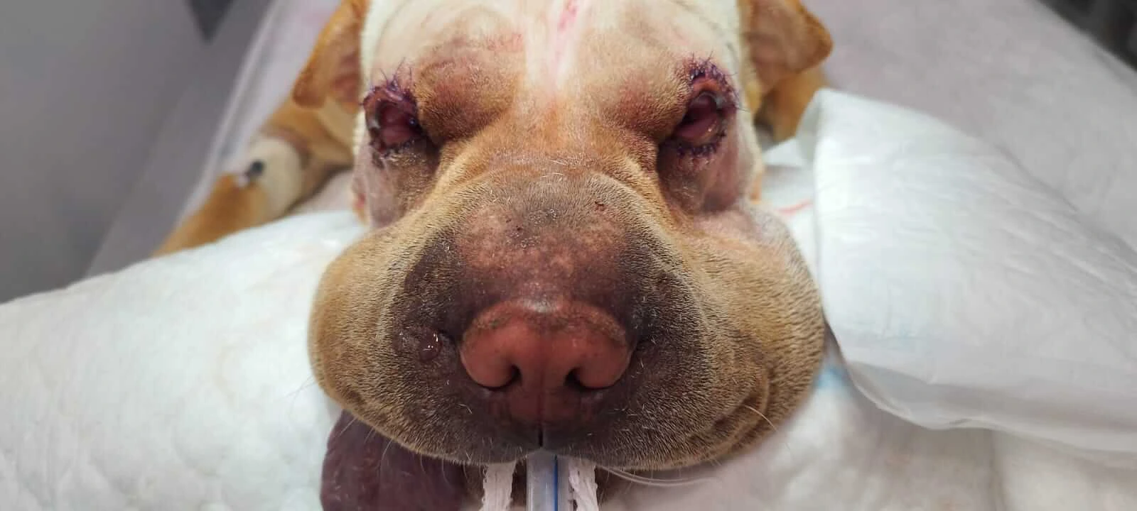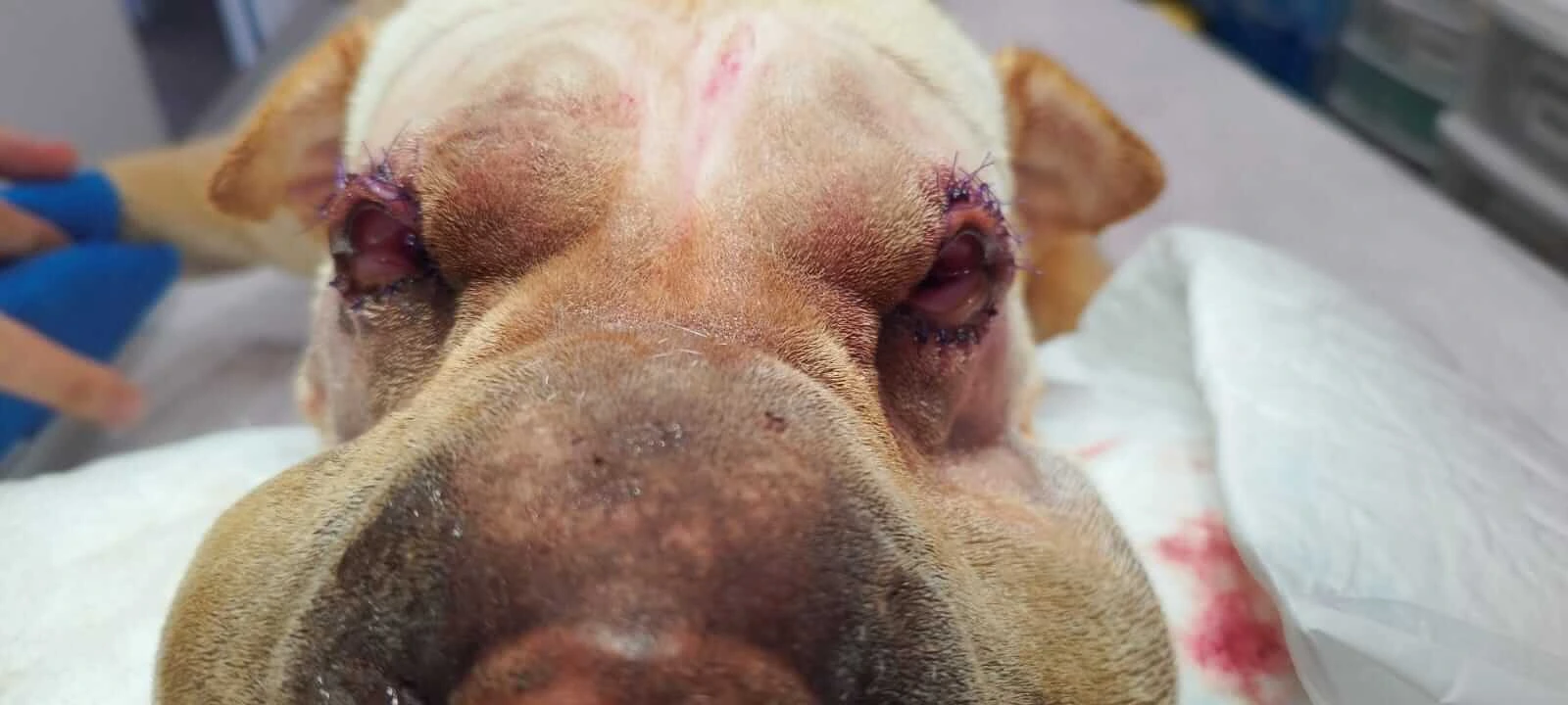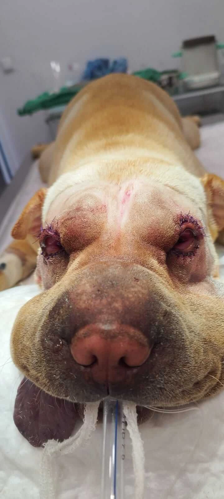 Este paciente presentaba entropión bilateral severo, una patología frecuente en razas como el sharpei, donde el párpado se pliega hacia dentro y las pestañas irritan la córnea.