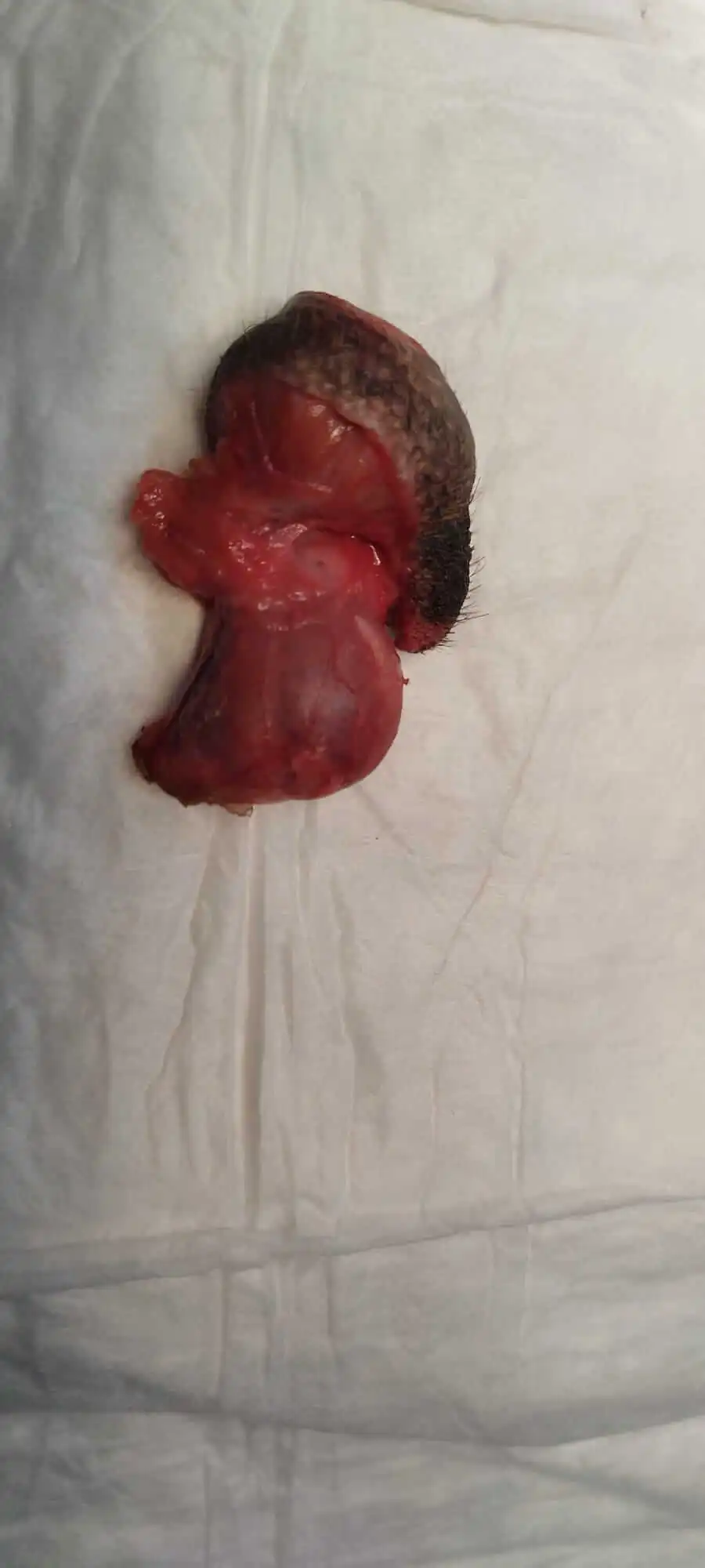 Se detectó un tumor ulcerado en el escroto, con crecimiento rápido y mal aspecto.