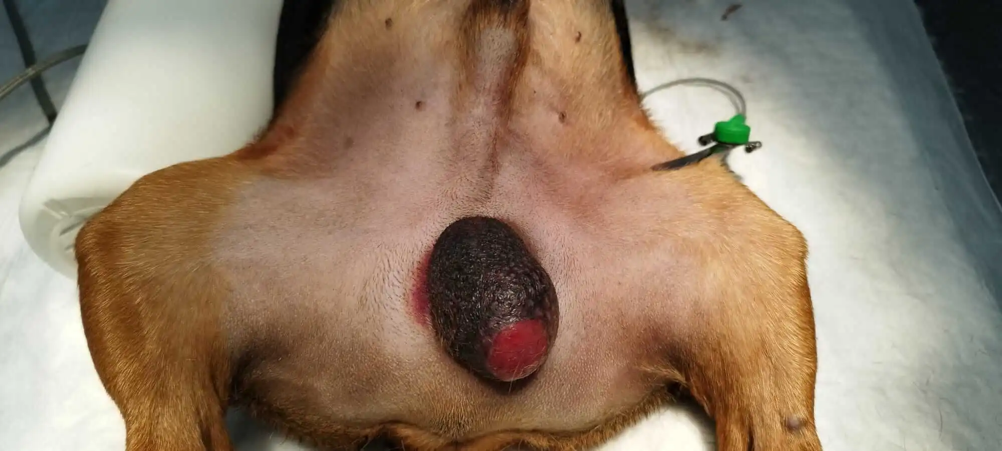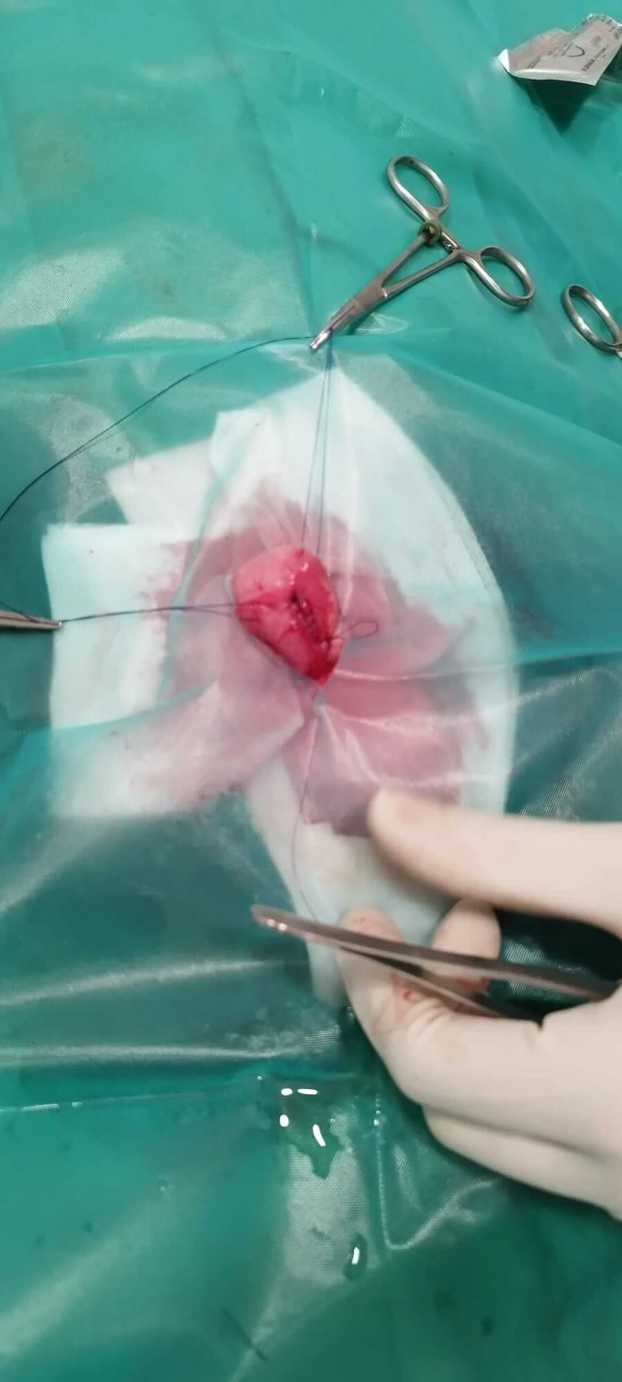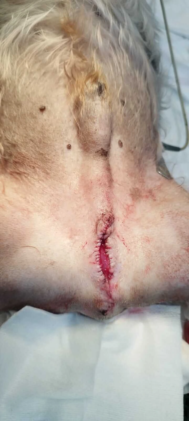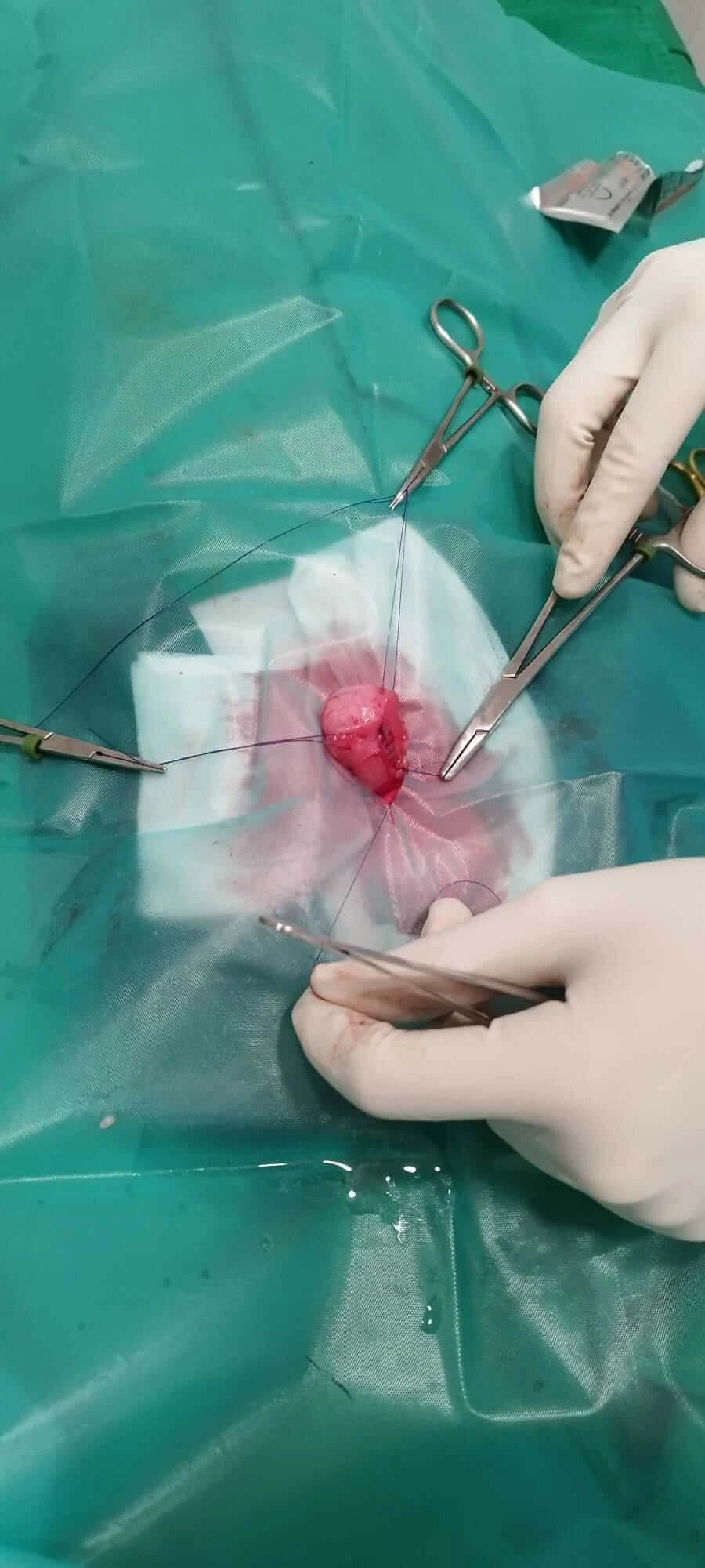 Aunque el tumor era de bajo grado, se optó por una resección amplia en bloque y se incluyó el ganglio linfático inguinal, extirpando también la quinta glándula mamaria. Durante la cirugía se sellaron cuidadosamente los vasos epigástricos para evitar hemorragias, se infiltró bupivacaína en la herida para el control del dolor y se realizó un cierre por planos.