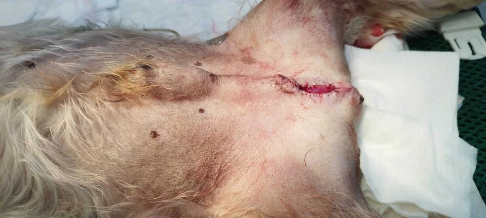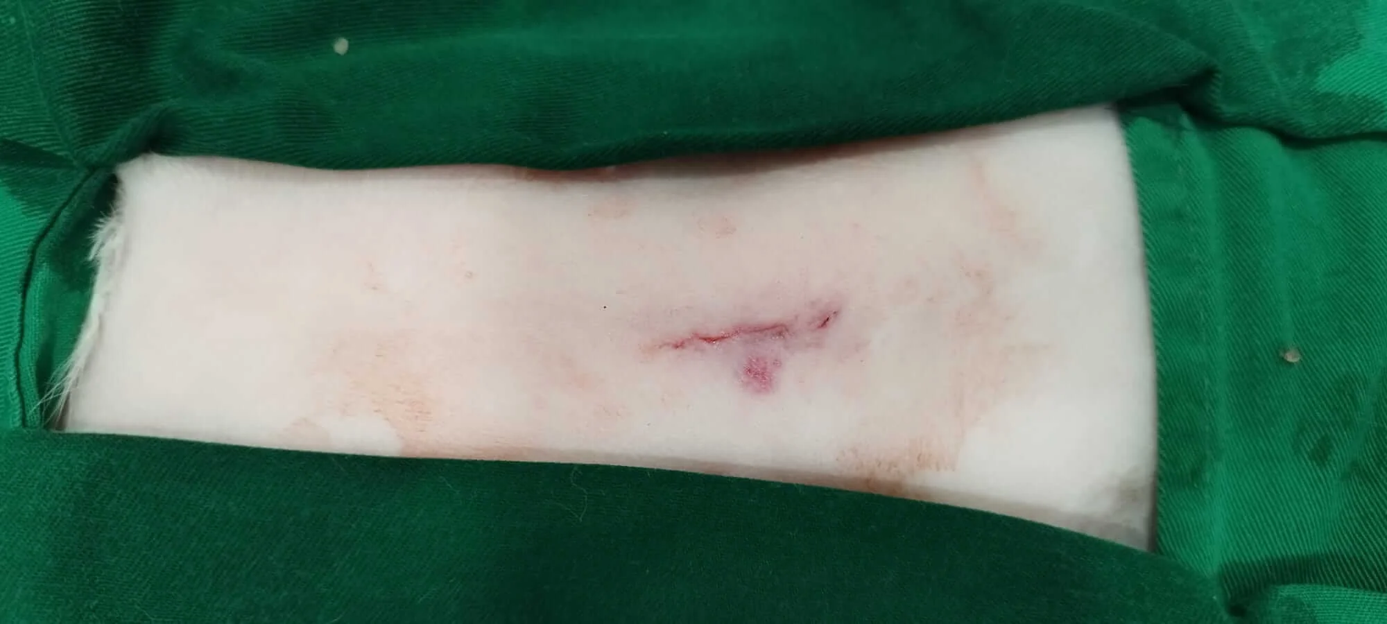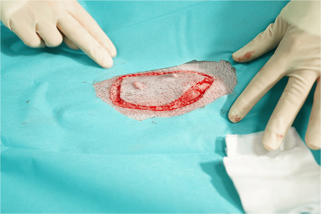 Aunque el tumor era de bajo grado, se optó por una resección amplia en bloque y se incluyó el ganglio linfático inguinal, extirpando también la quinta glándula mamaria. Durante la cirugía se sellaron cuidadosamente los vasos epigástricos para evitar hemorragias, se infiltró bupivacaína en la herida para el control del dolor y se realizó un cierre por planos.