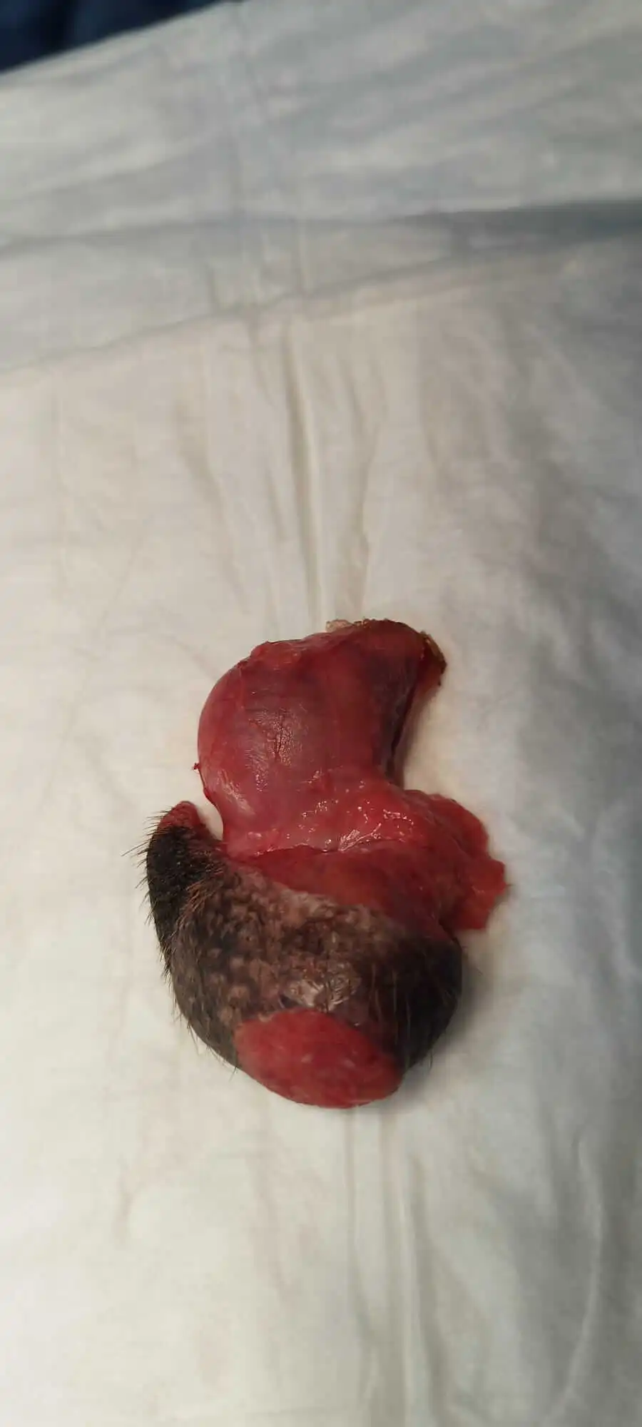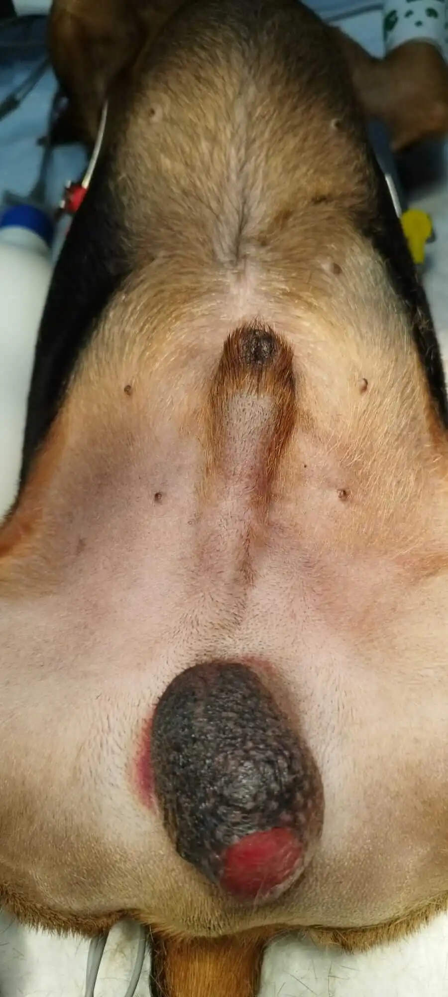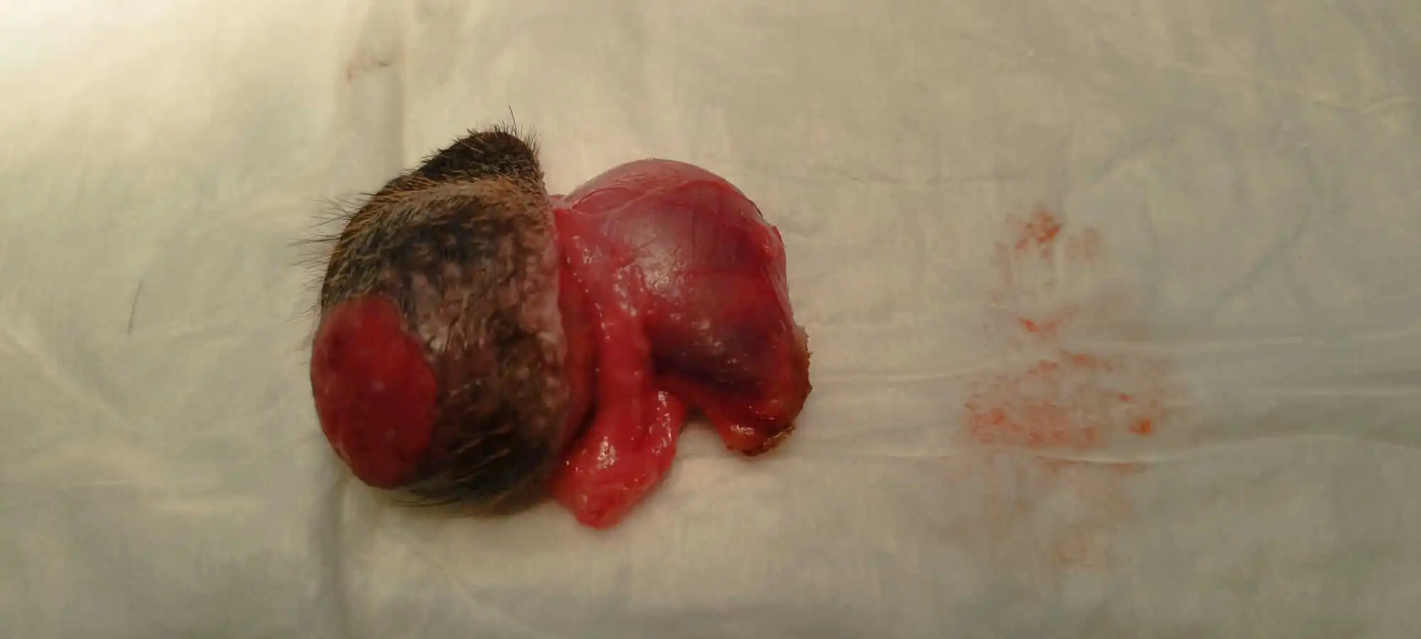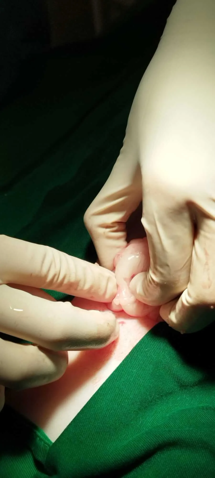 Aunque el tumor era de bajo grado, se optó por una resección amplia en bloque y se incluyó el ganglio linfático inguinal, extirpando también la quinta glándula mamaria. Durante la cirugía se sellaron cuidadosamente los vasos epigástricos para evitar hemorragias, se infiltró bupivacaína en la herida para el control del dolor y se realizó un cierre por planos.