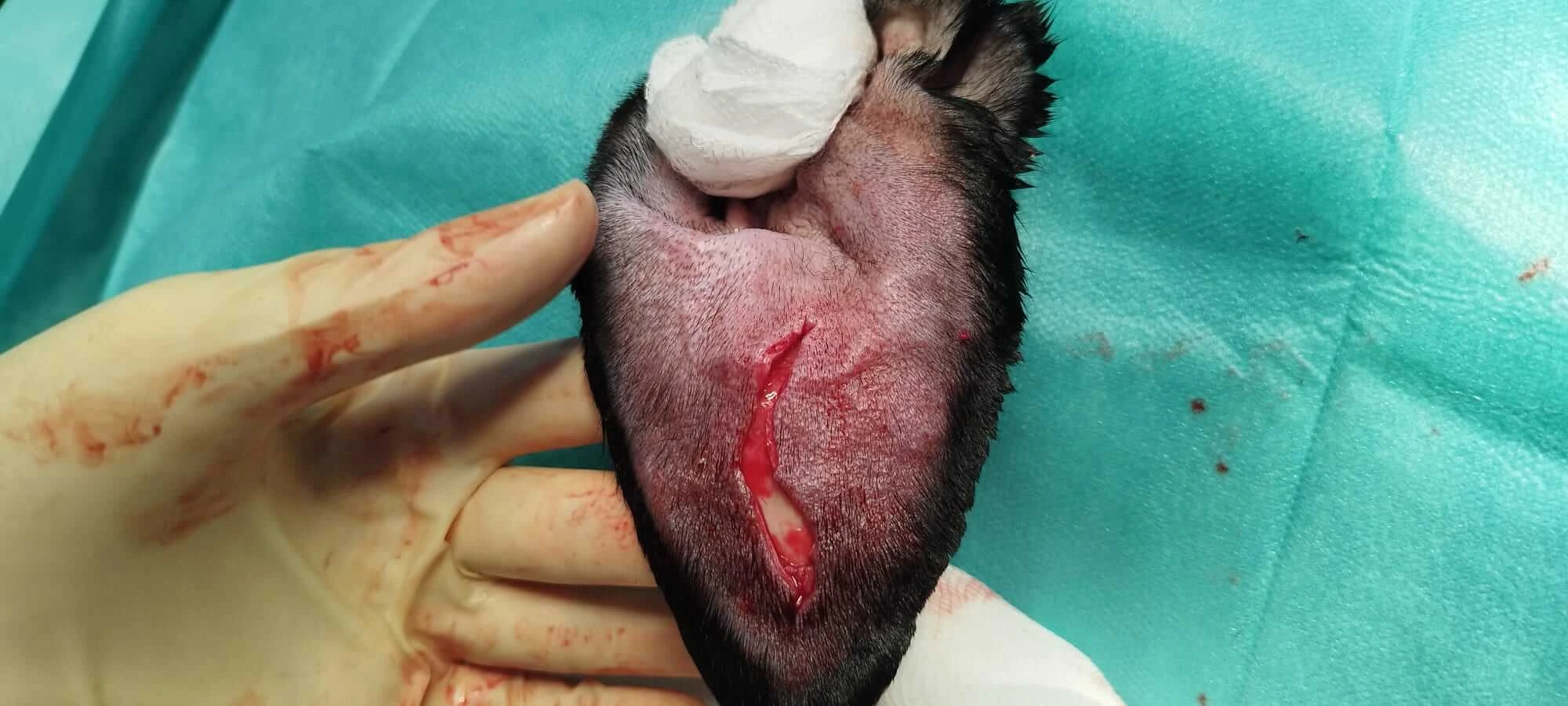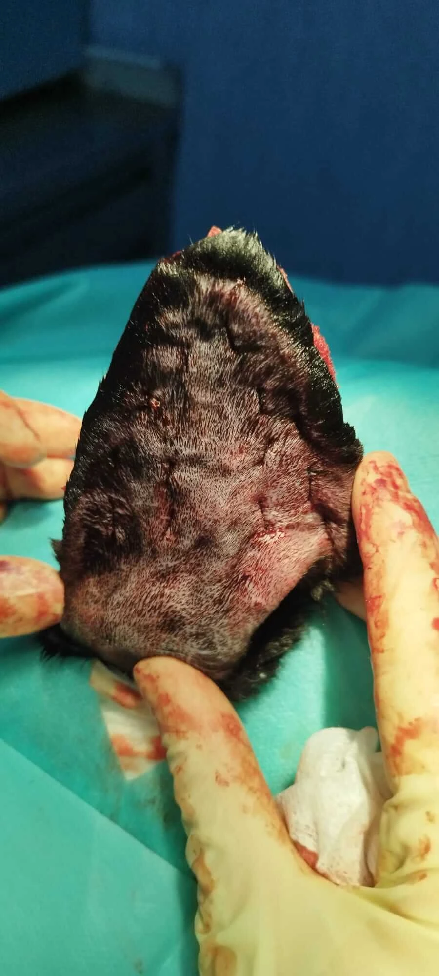 Se trató un otohematoma crónico mediante drenaje quirúrgico y colocación de una férula de sujeción con puntos en colchón vertical, para mantener el pabellón auricular plano y favorecer una correcta cicatrización.