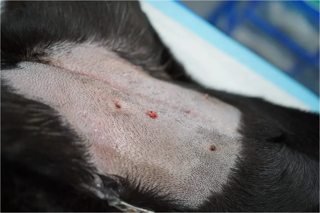 Durante una revisión rutinaria se detectó una masa subcutánea, bien delimitada y no adherida, entre las mamas L4 y L5. La citología confirmó que se trataba de un mastocitoma de bajo grado.